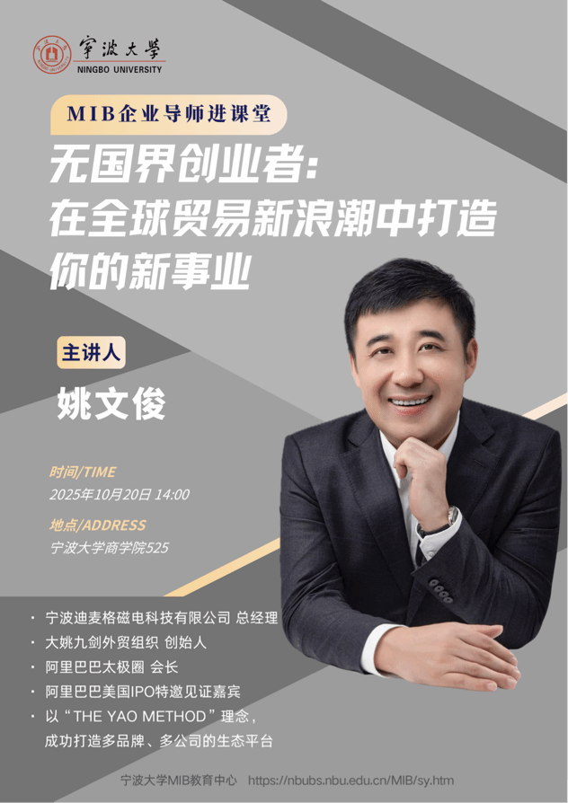 2025年10月20日下午,在宁波大学商学院525阶梯教室,2025级国际商务专硕迎来了一场题为“无国界创业者:在全球贸易新浪潮中打造你的新事业”的专题讲座。本次讲座由MIB教育中心主办,校外导师、宁波迪麦格磁电科技有限公司总经理姚文俊走进MIB《国际贸易政策与实务》课堂,为师生带来了一场融合个人创业经历与全球贸易洞察的精彩分享。