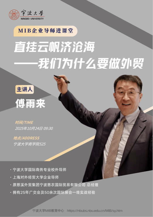 2025年10月24日上午,宁波大学商学院MIB教育中心特邀校外导师傅雨来走进《国际贸易政策与实务》课堂,为MIB学子带来了一场主题为“直挂云帆济沧海——我们为什么要做外贸”的精彩讲座。讲座在商学院525教室举行,MIB学位点负责人杨丽华教授主持,国际商务专业2025级全体研究生参加。