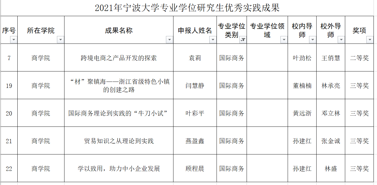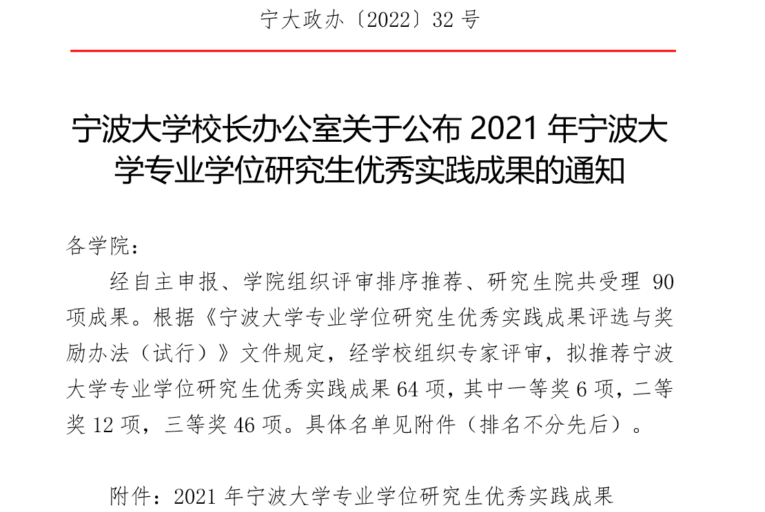 日前,2021年宁波大学专业学位研究生优秀实践成果奖评审结果公布。本学位点袁莉等5位同学榜上有名,特此祝贺!