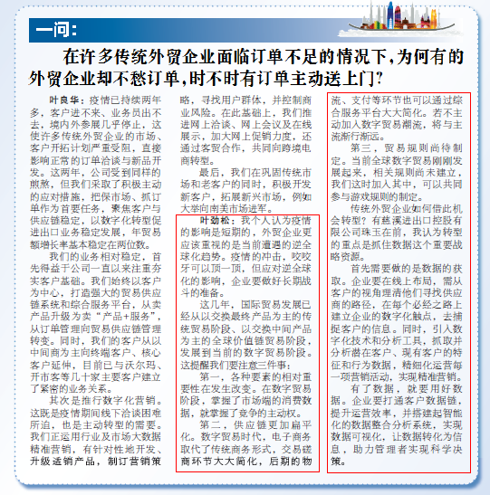 日前,国际商务专业硕士教育中心执行主任叶劲松老师受邀参加《宁波日报》甬派“外贸热点面对面”节目录制,就外贸企业数字化转型建言献策。