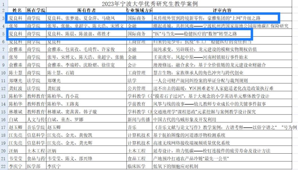 日前,2023年宁波大学优秀研究生教学案例评选结果公布,MIB学位点教师夏良科与本专业研究生合作的两篇案例获评优秀案例。特此祝贺!