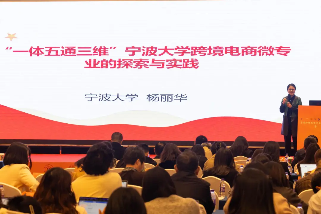 杨丽华教授以《“一体五通三维”宁波大学跨境电商微专业的探索与实践》为题,全面回顾了宁波大学跨境电商微专业的发展历程。杨教授总结了“一体五通三维”建设内容及其阶段性成果,为跨境电商领域的人才培养提供了一种新型校园实景下的校企协同育人模式的实践探索。