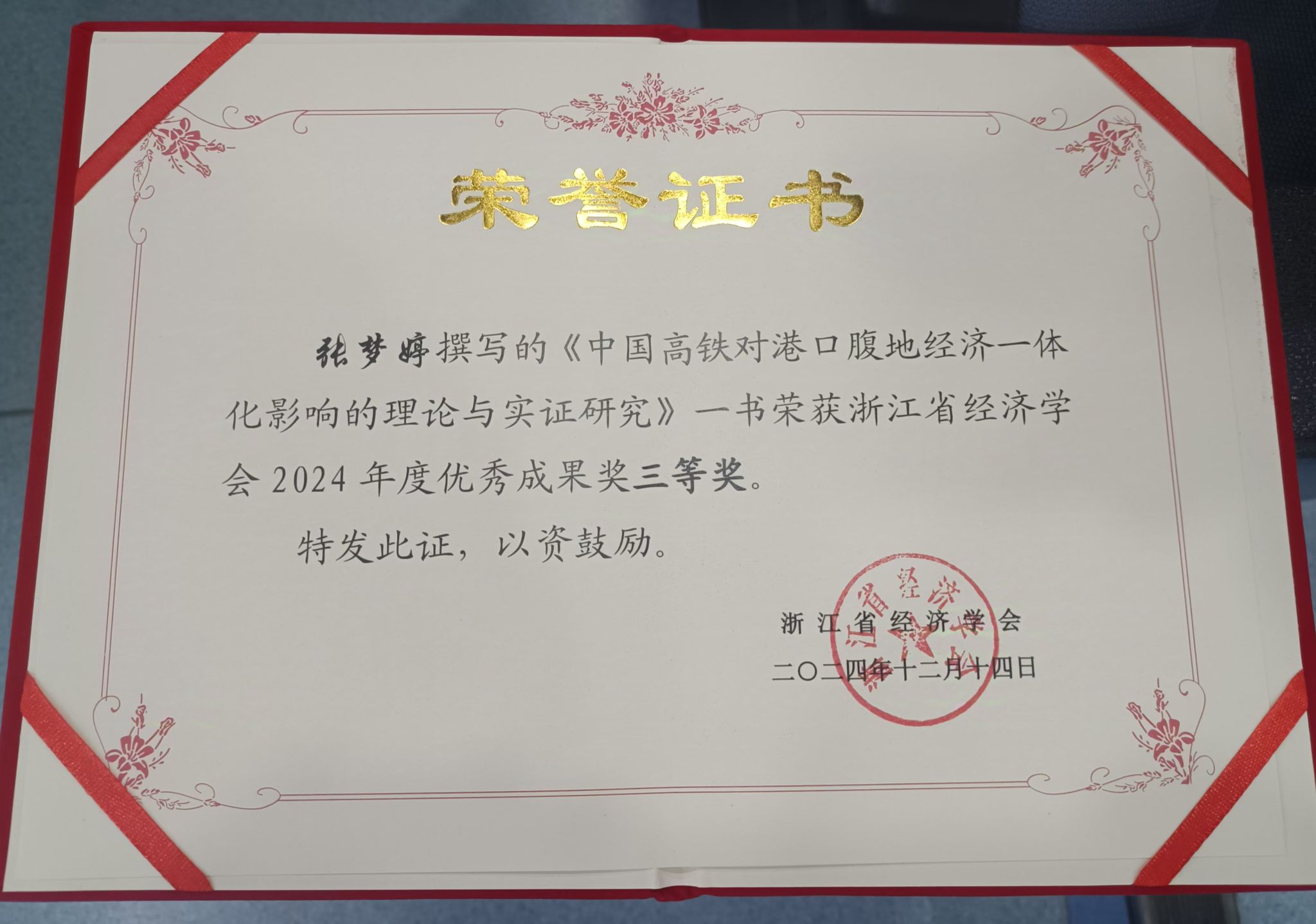在闭幕式上,学会宣布了年度优秀成果奖和年会优秀论文获奖名单。我校MIB专职导师张梦婷副教授的专著《中国高铁对港口腹地经济一体化影响的理论与实证研究》获评年度优秀成果奖三等奖,2023级MIB研究生朱艺蕾的论文《制度型开放促进消费结构升级了吗?——来自“一带一路”倡议的经验证据》获评年会优秀论文。