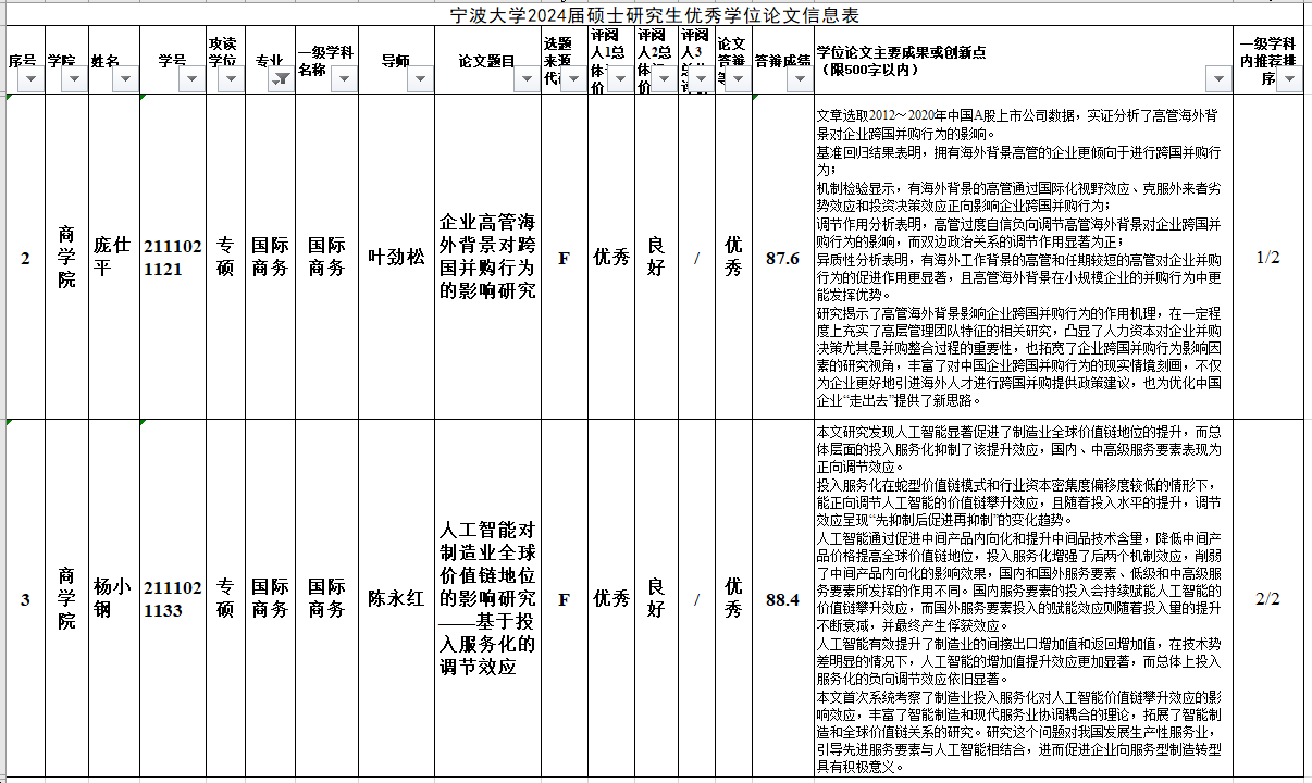 3月24日,宁波大学研究生院公示“宁波大学2024届研究生优秀学位论文”评选结果名单,我校2021级MIB学生庞仕平、杨小刚两位同学的学位论文获评校级优秀论文。