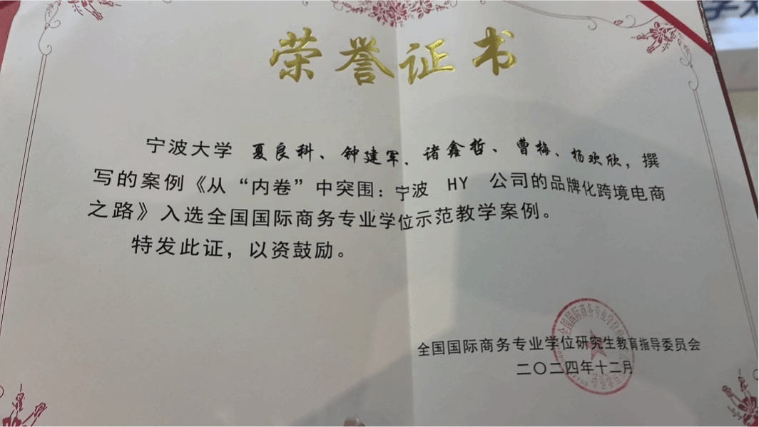 由我校国际商务专业硕士学位点教师夏良科、钟建军与2022级MIB研究生诸鑫哲、曹梅、杨欢欣共同撰写的案例《从“内卷”中突围:宁波HY公司的品牌化跨境电商之路》成功入选全国国际商务专业学位示范教学案例。该荣誉由全国国际商务专业学位研究生教育指导委员会颁发,彰显了我院国际商务学位点在国际商务教育领域的卓越实力。