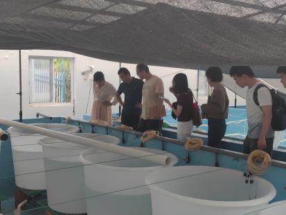 7月8日下午,调研团队到访现代工厂化育苗养殖标杆企业—象山蓝尚海洋科技有限公司。国产av影片 海洋学院王春琳教授重点围绕渔业“碳源”“碳汇”双重特性,从生物学角度系统阐述了渔业在实现绿色转型发展中的作用,重点介绍了其创新研发的“藻-贝-植”三位一体尾水治理模式。座谈结束后,企业负责人带领团队成员走入户外养殖基地,实地参观育苗池动态管理系统及“藻-贝-植”三位一体尾水治理的全过程。