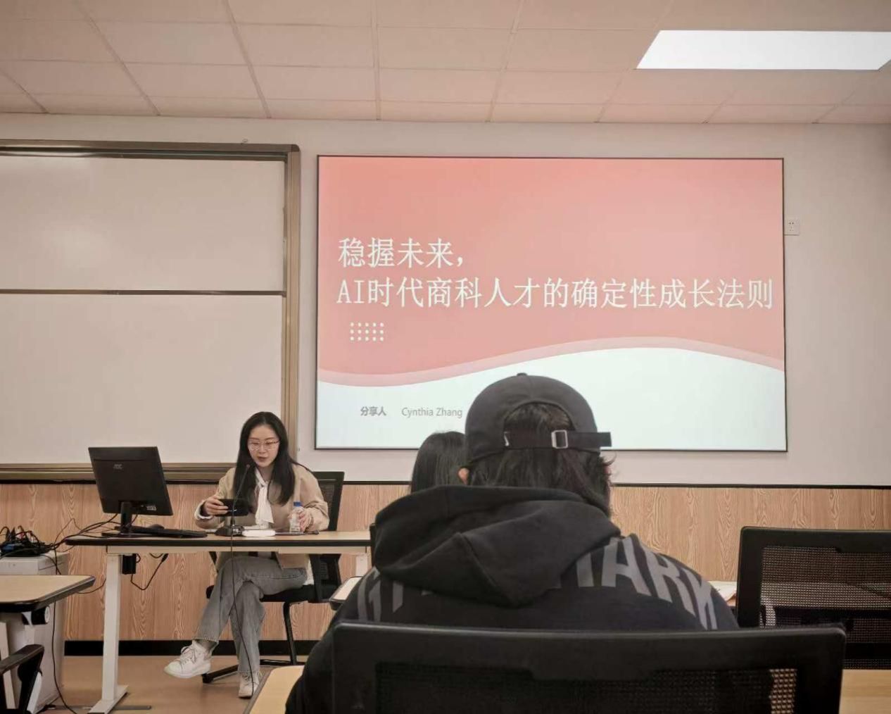 昨日下午(22日),商学院就业指导中心在曹光彪楼422教室举行AI时代下商科人才培养法则专题讲座。本次讲座特邀高顿教育资深HR张小可担任主讲嘉宾,2023级、2024级本科生代表参加。