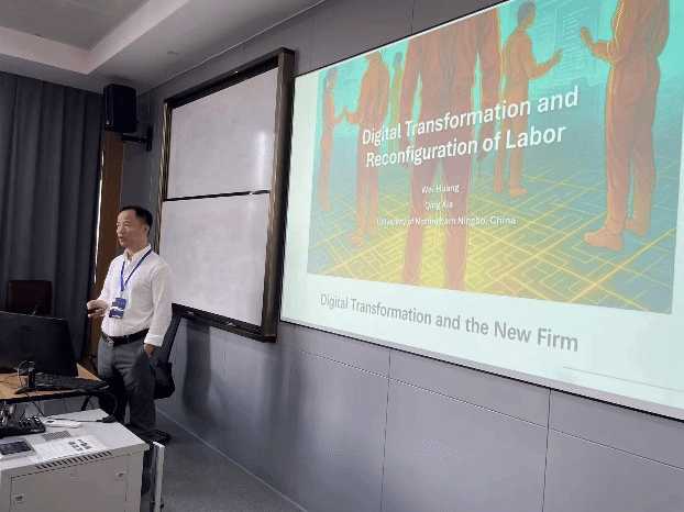 下午由宁波大学商学院郝立亚副教授主持大会报告。两位特邀嘉宾分别进行了精彩的主旨演讲。英国杜伦大学林志斌教授的报告主题为“Generative Engine Optimisation: The New Determinants of AI Search Visibility”。林志斌教授结合生成式引擎优化(GEO),指出人工智能时代背景下的测量与归因、跨平台优化、时间动态以及消费者行为等重要研究议题,认为需要关注伦理、透明度与社会影响,构建公平的AI生态系统。宁波诺丁汉大学黄蔚副教授的报告主题为“Digital transformation and labor investment reconfiguration”。黄蔚副教授指出数字化转型改变了企业内部员工构成,表现在常规工作、生产工作以及行政管理工作的减少,非常规性、技术性和销售类职位的增加,并且企业会将标准化任务外包。