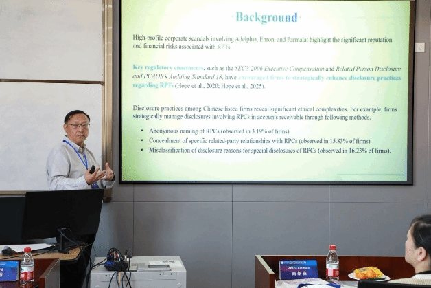 开幕式后,上午由宁波大学刘起贵教授和唐京华副教授主持大会报告。三位特邀嘉宾分别做了各具特色的主旨演讲。中南财经政法大学的石劲教授,国家重大人才工程讲席学者,进行了题为“Trade Credit Provisions for Related-Party Customers”的主旨演讲。石劲教授分析了企业向关系型客户和非关系型客户提供的贸易信贷差异,指出与关系型客户的互动显著加大了合规压力、财务风险和声誉方面的顾虑,致使企业缩减贸易信贷,以此作为符合监管要求和降低潜在声誉损害的策略。澳门城市大学金融学院院长,Wai Kong (Adrian) Cheung教授的演讲题目为“AIs and corporate governance-a risk management perspective”。Wai Kong (Adrian) Cheung教授指出人工智能与公司治理之间存在着一种动态的双向关系:一方面,人工智能改变了治理的实践方式。它增强了监督力度,减少了信息不对称现象,并引入了新的道德和监管责任;另一方面,公司治理框架则塑造了人工智能的开发和部署方式,从而确保其得到符合道德、透明且负责任的使用。英国卡迪夫大学Kent Matthews教授发表了以“FinTech and Relationship Banking: Partners or Rivals”为题的精彩演讲。Kent Matthews指出金融科技平台和数字银行平台共同占据了小额贷款市场。银行对每位申请人的贷款额度会比金融科技平台更高。关系经理对于在庞大的贷款市场中建立稳定性和平衡性是至关重要的。人工智能无法在所有方面都取代关系经理的角色。