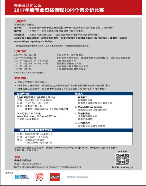 获取更多比赛详情,请参阅香港会计师公会官网或致电其北京办公室:白老师 010-56500551。
