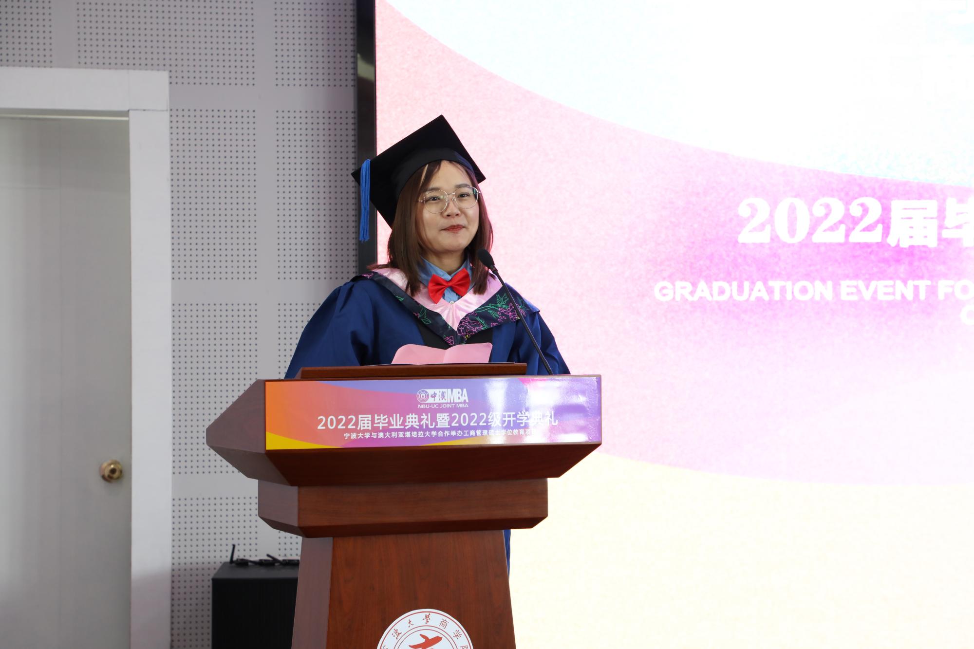 毕业生代表刘亚兰深情回眸了在宁波大学中澳MBA项目学习这两年的经历,并将这段MBA之旅概括为是“一段收获知识,开拓眼界,增强能力”以及“不分年龄,不分职业,互取所长,相互融合的好友添加”旅程。感动满满,正能量满满。