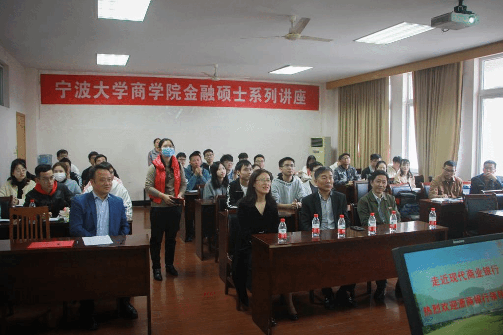 接着,蒋书记通过影片向在场的师生介绍了浙商银行作为一家零零后股份制商业银行的独特文化;后结合亲身经历,介绍浙商银行的筹建过程及浙商银行宁波分行的发展历程。作为第一家分行,宁波分行服务地方经济,发展普惠金融促进小微企业成长,得到社会各界人士认同。