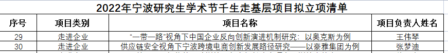 国际商务专业硕士王伟琴、张梦迪担任负责人的两个项目入选2022年宁波研究生学术节“千生走基层”之“走进企业”类别项目。