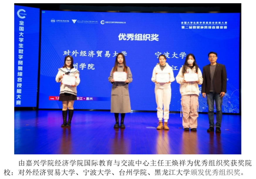 也被授予优秀组织奖。我校旨在培养具备全面的国际商务视野和国际化经营管理能力的人才,使其能够灵活应对全球商务环境和市场的变化。此次全国大学生数字贸易综合技能大赛促使MIB学子在实践中把握市场,与真实的客户面对面交谈,全英文的直播方式提升了其跨文化交流的能力,这对于今后的跨国商务合作和职业盛业发展都将带来重要帮助。