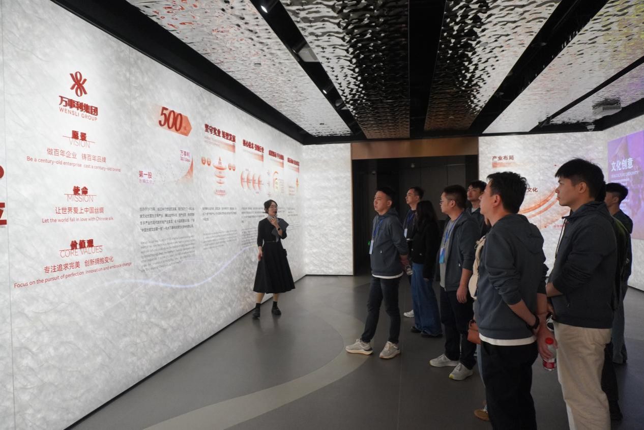 11月15日下午,学员们来到万事利集团,聚焦“传统丝绸产业的转型升级”。在万事利展厅,大家循着企业发展脉络,见证了这家昔日“乡镇企业”在沈爱琴女士的带领下,逐步成长为上市公司的奋斗历程,讲解员也向学员介绍了在近几年的布局,万事利通过 AI 技术优化丝绸印染工艺、提升图案设计效率,同时借助杭州亚运会等国际赛事 IP,将丝绸文创产品推向全球,让传统非遗焕发现代活力。学员们近距离观察丝绸产品的创新呈现,深入了解传统产业与新技术、新场景融合的落地路径。