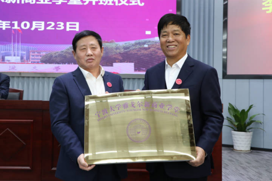 仪式上还举行了新商业学堂的揭牌、授牌和授旗。宁大学生学员代表竺楷英发言,她说:“很荣幸成为首期学员,感谢学校和雅戈尔提供珍贵的学习机会,会继承和发扬好雅戈尔反哺社会和宁‘宁波帮’造福桑梓的感恩精神,勤勉学习,学以致用,努力成为能为企业、为行业、为社会解决问题的新时代商业人才。”宁大2006级校友、雅戈尔常务副总徐鹏以“双重身份”表达了对母校35周年校庆的祝贺,也希望学员抓住机会学习,破解新零售行业的发展难题,以后能加入雅戈尔大家庭,为企业发展献计献策。