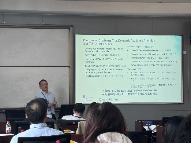 下午由宁波大学商学院郝立亚副教授主持大会报告。两位特邀嘉宾分别进行了精彩的主旨演讲。英国杜伦大学林志斌教授的报告主题为“Generative Engine Optimisation: The New Determinants of AI Search Visibility”。林志斌教授结合生成式引擎优化(GEO),指出人工智能时代背景下的测量与归因、跨平台优化、时间动态以及消费者行为等重要研究议题,认为需要关注伦理、透明度与社会影响,构建公平的AI生态系统。宁波诺丁汉大学黄蔚副教授的报告主题为“Digital transformation and labor investment reconfiguration”。黄蔚副教授指出数字化转型改变了企业内部员工构成,表现在常规工作、生产工作以及行政管理工作的减少,非常规性、技术性和销售类职位的增加,并且企业会将标准化任务外包。