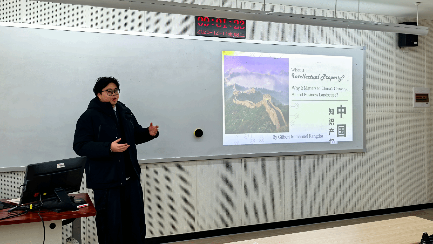 On December 17th, a professional lecture themed "What is Intellectual Property? Why is it Crucial for China's Booming AI and Business Landscape?" was held in Classroom 2-411 of Ningbo University. Delivered by Gilbert Immanuel (Jiang Kexing), an international intellectual property consultant and trademark attorney from Tranfan Law Office, and moderated by Teacher Chen Shihui from Ningbo University, the lecture was based on the special undergraduate practical teaching reform project "Bilingual Course on Entrepreneurship in the Digital Age". It brought a feast of intellectual property knowledge with both theoretical depth and practical value to teachers and students.
