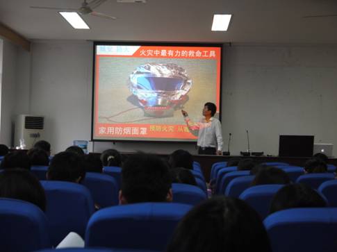 本次活动采取“讲座+演练”的形式,将理论与实践相结合。我们有幸邀请到了宁波市谐安防火知识中心的专业老师邬玉伟老师进行消防知识讲座与演练的现场指导。讲座中,邬老师给大家生动地介绍了火灾发生的原因,灾害现场逃生的技巧以及如何利用身边地事物保护自己等火灾现场的自救方法,讲解生动激情洋溢,同学们认真听讲积极提问,讲座进行的同时参与人员认真填写防灾减灾竞赛试题,将学到的知识进行巩固。同学们在认真听讲和观摩后,亲自体验了现场逃生的过程。逃生演练在本部公寓3号楼进行,面对烟幕弹模拟的滚滚浓烟,学生们表现地十分勇敢,按照邬老师指导的方法从6楼有序地进行逃生演习。应急演练紧张有序,安全保证工作到位,这与演习过程得到了学校保卫处与学生社区管理中心的大力支持密不可分。